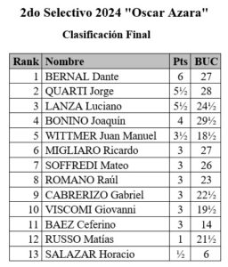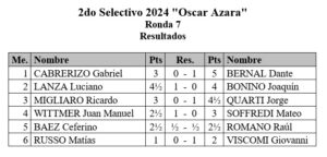 Tras disputarse la Septima fecha del Selectivo «Oscar Azara» Bernal Dante con 6 puntos continua liderando el selectivo al ganarle su partida a Cabrerizo Gabriel y a medio punto del lider siguen escoltandolo Luciano Lanza y Jorge Quarti a medio punto al ganarle sus partidas Luciano Lanza a Bonino Joaquin y Jorge Quarti a Ricardo Migliaro.