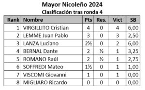 El Torneo Mayor Nicoleño de Ajedrez 2024 sigue su curso en el Club Lavalle, con Cristian Virgillito consolidándose como el gran favorito. Tras disputar cuatro rondas, el campeón defensor sigue imbatible, mostrando un nivel sobresaliente. En su última partida, Virgillito se impuso a Ricardo Migliaro, lo que le permitió afianzarse en la cima de la tabla de posiciones.