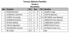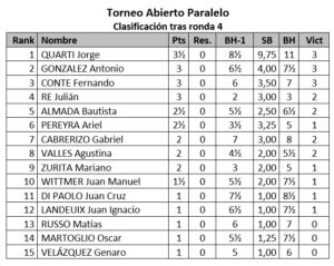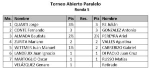 En paralelo al Mayor, también se está desarrollando el Torneo Paralelo, que reúne a varios ajedrecistas locales en busca de consagración. En este certamen, Jorge Quarti se mantiene en lo más alto de la tabla con 3.5 puntos, tras unas disputadas tablas frente a Ariel Pereyra en la última ronda. Con este resultado, Quarti sigue liderando el torneo, aunque ahora cuenta con la presión de tres escoltas que se acercan peligrosamente.