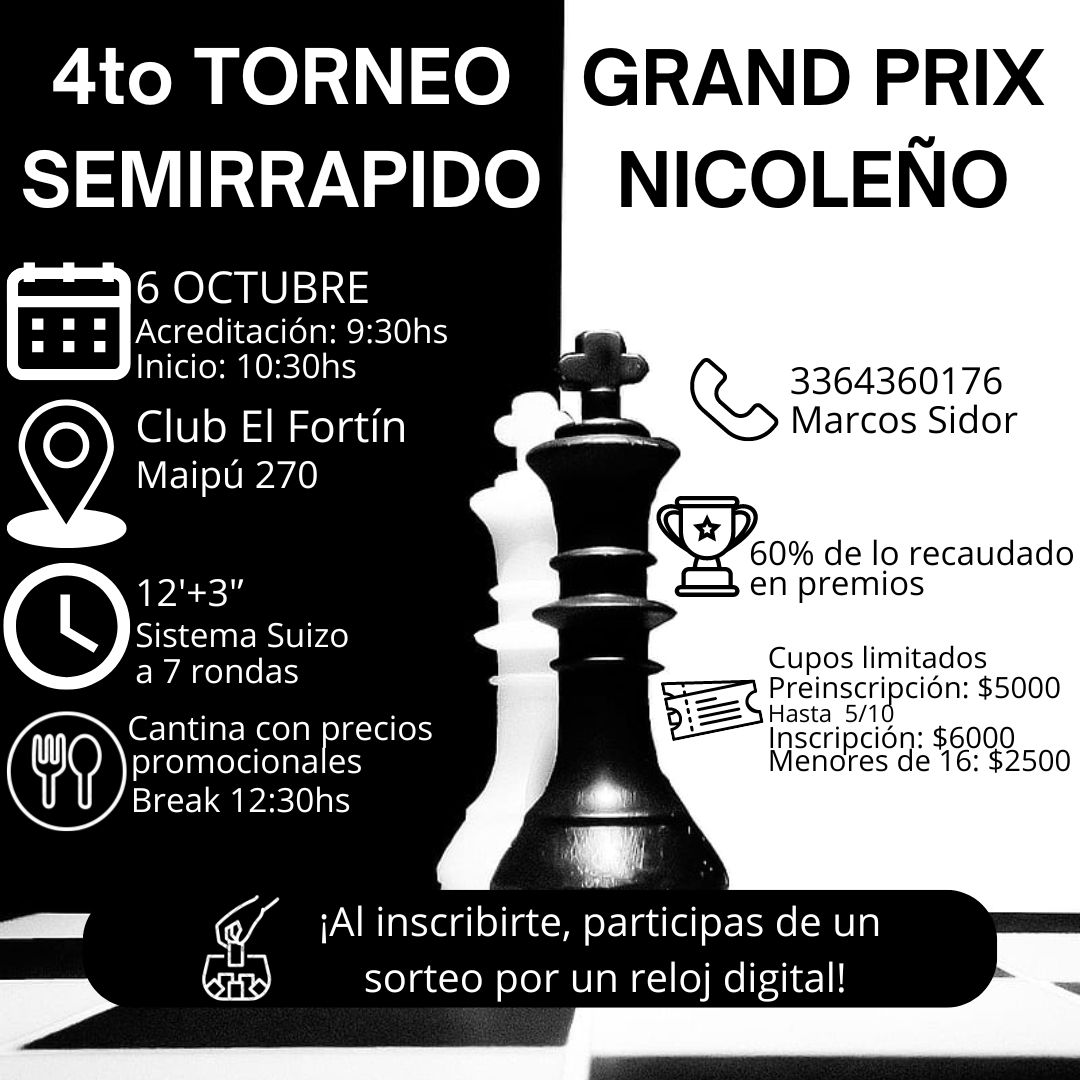 El próximo domingo 6 de octubre, las instalaciones del Club El Fortín serán el escenario del último torneo semirrápido del año, una cita esperada por los aficionados y jugadores del ajedrez nicoleño. El evento, que se desarrollará bajo un ritmo de partidas acelerado, promete reunir a los mejores exponentes locales en una competencia vertiginosa y de alto nivel.
