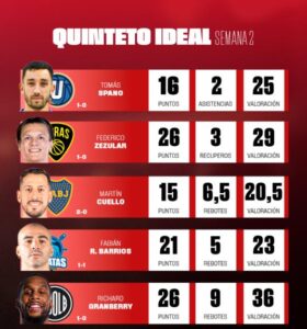 En este contexto, se eligió el “quinteto ideal de la semana”, compuesto por jugadores que brillaron con sus actuaciones individuales y fueron determinantes para sus equipos: